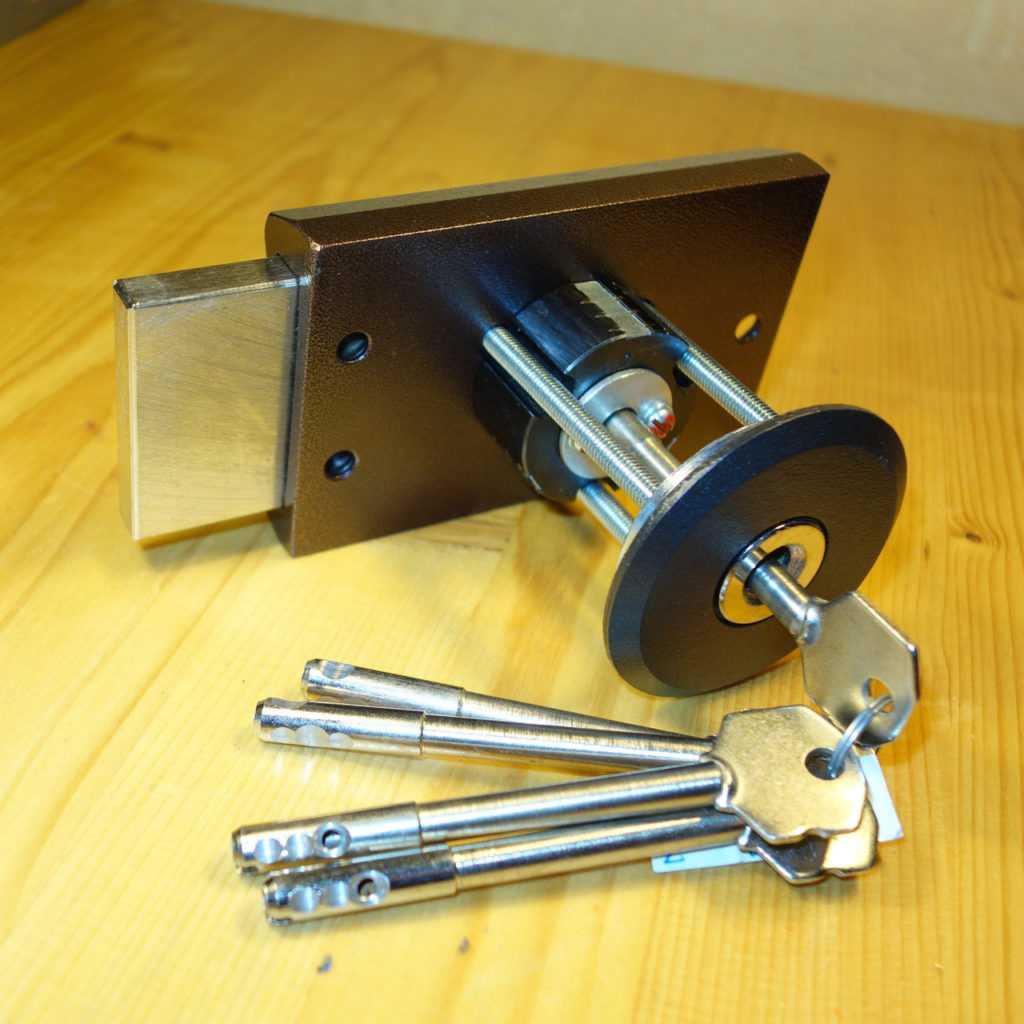 Такие запорные системы характеризуются высокой степенью надежности. Их часто используют для металлических дверных конструкций, въездных ворот или для сейфов. Они достаточно массивные и тяжелые, поэтому для деревянных полотен не подходят.