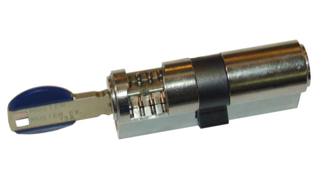 Менять сам корпус при этом нет необходимости. Ключ — плоский лист металла с зубьями по бокам или лазерной фрезеровкой на его поверхности. Механизм цилиндра представляет собой набор штифтов, которые при повороте ключа выстраиваются в одну линию, выполняя тем самым разблокировку замка и выдвижение ригелей.