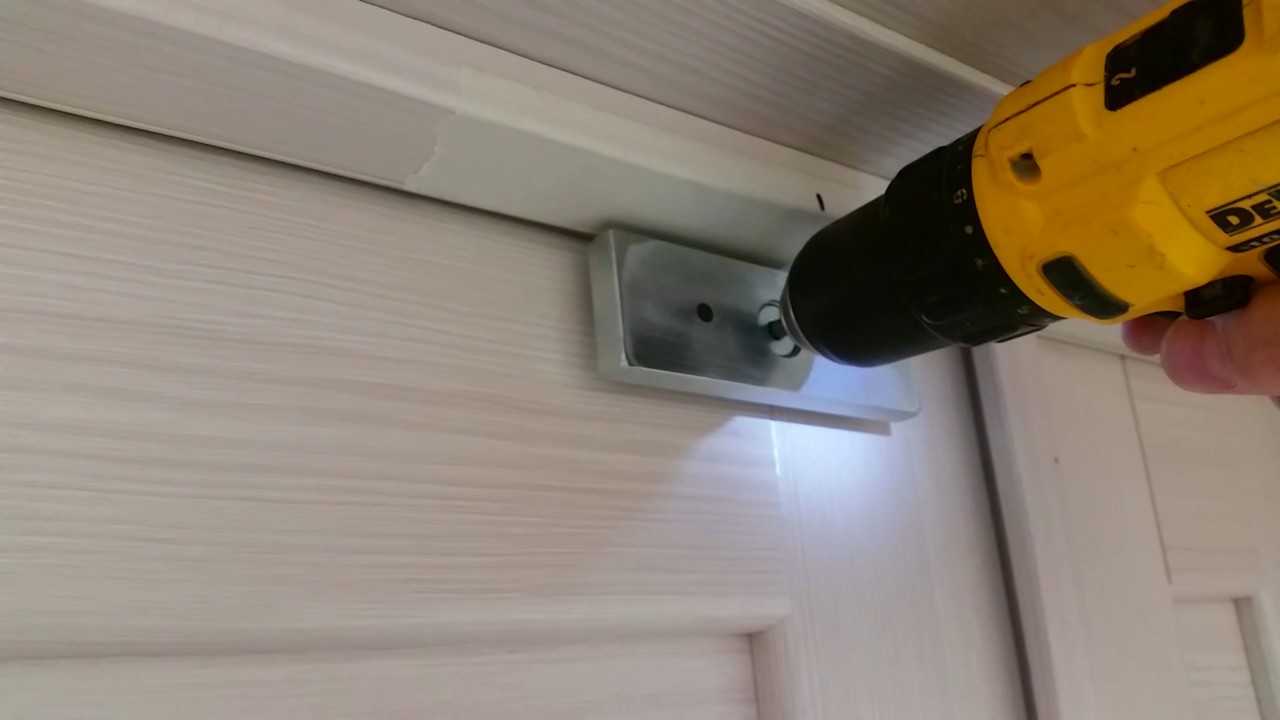 Сверлим дрелью отверстие под «язычок» защелки, остальную часть заглубляем с помощью долота и стамески на глубину 1-2 мм в зависимости от глубины планки. Теперь остается лишь прикрутить планку на два шурупа. Отмечаем шилом центру отверстий под шурупы и дрелью делаем отверстия нужного диаметра. Далее шуруповертом крепим планку к косяку.