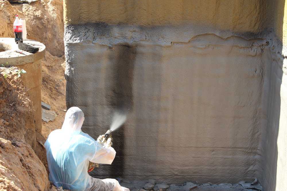 - Следующим этапом вам понадобится сделать гидроизоляцию фундамента. Ее можно выполнить из обмазочных, рулонных или напыляемых средств – вариант зависит от вашего желания и бюджета.