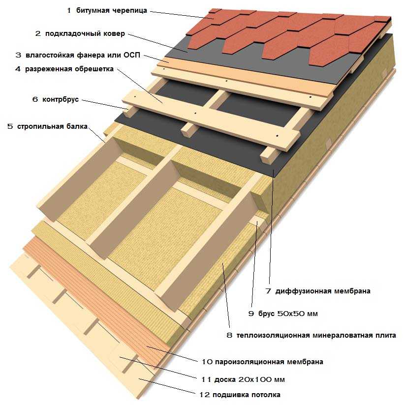 Утепление крыши минеральной ватой производят по следующей схеме: