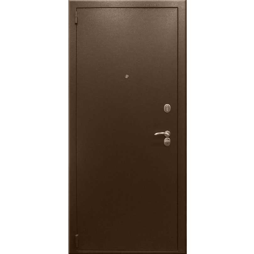 Несмотря на простоту, прочность этой модели соответствует классу М3, а металл защищен оцинковкой для предотвращения коррозии. Также изделие оснащено двумя противосъемными фиксаторами, блокирующими снятие двери при срезании петель.