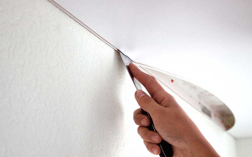- Когда разрез находится не более чем в 10-15 см от стены, его можно запрятать в багет. Для этого необходимо демонтировать часть полотна из профиля, срезать материал до места пореза, приклеить гарпун по краю полотна. Затем, нужно разогреть тепловой пушкой или строительным феном данный участок и плавно заправить полотно в профиль с помощью специального шпателя.