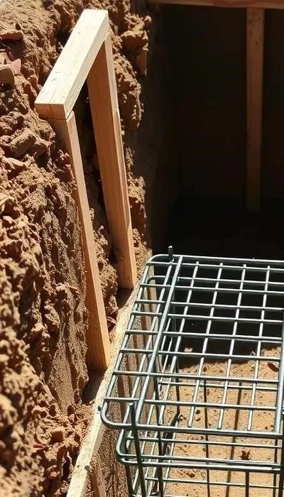 Опалубка формирует контур. Из щитов, устанавливается вертикально, крепится распорками для давления бетона. Важны герметичность, прочность.
