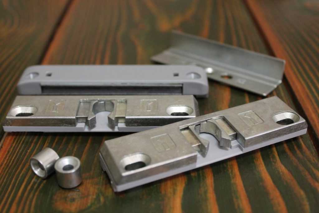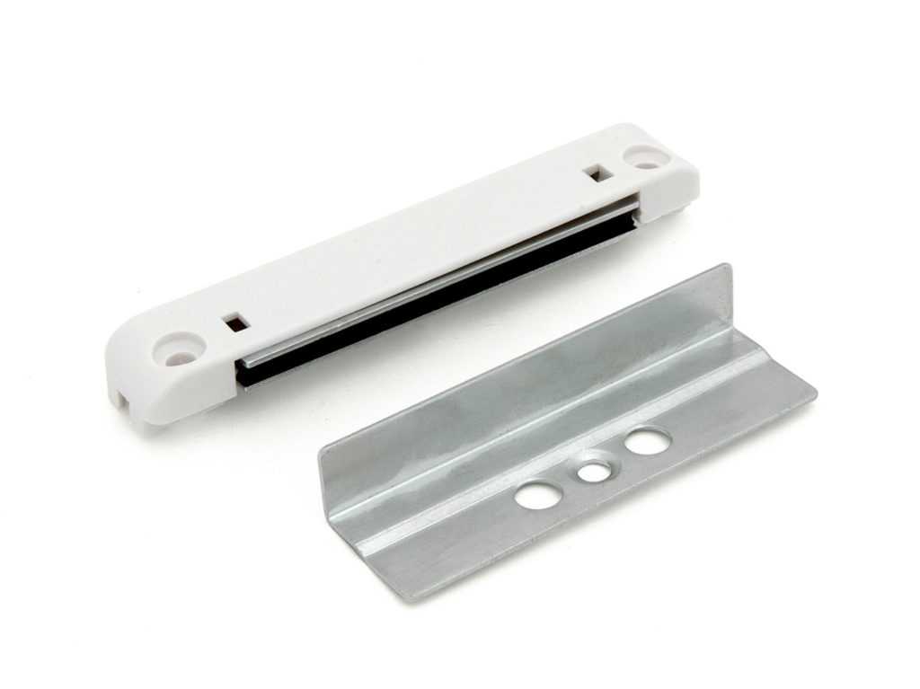 Магнитные защелки включают две основные детали:магнит, который устанавливается на корпус двери (коробе); он «спрятан» в пластиковый корпус, который прикручивается саморезами; а также пластины из металла (стали), которая притягивается к магниту и за счет этого удерживает полотно. Такая пластинка фиксируется на створке.