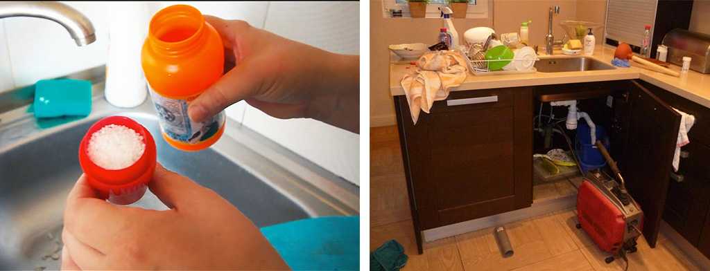 | Поваренная соль | Высыпьте необходимую часть соли в сливную систему. Спустя 2-3 часа смойте большим количеством воды. |